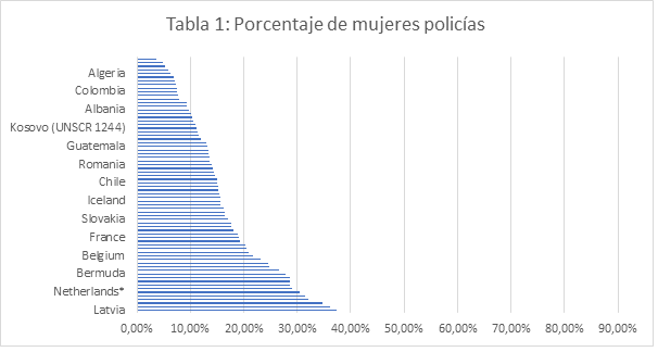 A pesar de la existencia de marcos jurídicos y normativos internacionales, las instituciones de justicia penal, especialmente los servicios policiales, continúan siendo dominadas por hombres heterosexuales. Con regularidad, la UNODC recolecta datos con el número y porcentaje de mujeres policías y jueces en el mundo. Según los datos recogidos en septiembre de 2018, el porcentaje de mujeres policías en todos los países estudiados varía entre el 3% y el 37%, con un índice del 10% al 20 % en la mayoría de países. La tabla 1 a continuación muestra el porcentaje de mujeres policías en algunos países.