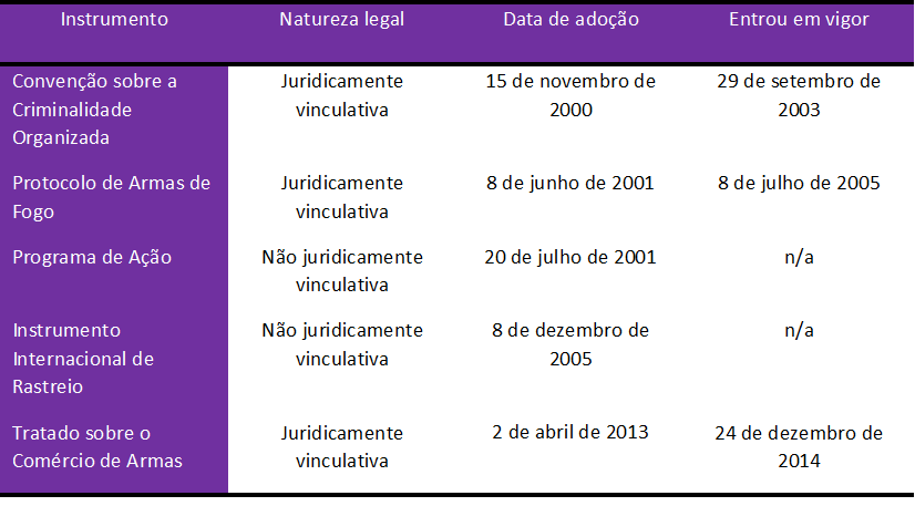 O Tratado sobre o Comércio de Armas, o UNTOC e seu Protocolo de Armas de Fogo são tratados multilaterais, que contêm normas juridicamente vinculativas e, em sua maioria, obrigatórias. Os Estados acessam esses instrumentos através de um processo formal de adesão de homologação, aceitação ou aprovação, seguido dos quais o Estado adere aos instrumentos e se compromete a cumprir com as obrigações neles definidas. Embora adotados pelos mesmos órgãos, o PoA-ISS e o Instrumento Internacional de Rastreio (IIR) são instrumentos não juridicamente vinculativos, e não necessitam de um processo formal para acesso. Portanto, eles não estabelecem obrigações legais, mas baseiam-se em cumprimento voluntário e requerem compromisso político. O PoA-ISS é, como o nome sugere, um programa que estabelece medidas que os Estados se empenham em realizar em nível nacional, regional e global. Similarmente, o IIR pode ser denominado uma ferramenta normativa para facilitar o processo de rastreamento.