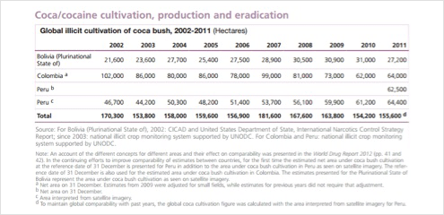 Global illicit cultivation of coca bush in 2011 remained at around the same level as in 2010. Most of the world's coca bush is cultivated in the Andean countries of the Plurinational of State of Bolivia, Colombia and Peru. After several years of increases since 2005, the Plurinational State of Bolivia saw a decrease in coca bush cultivation of 12% in 2011. Colombia and Peru, on the other hand, experienced small increases in the area under coca bush cultivation. |