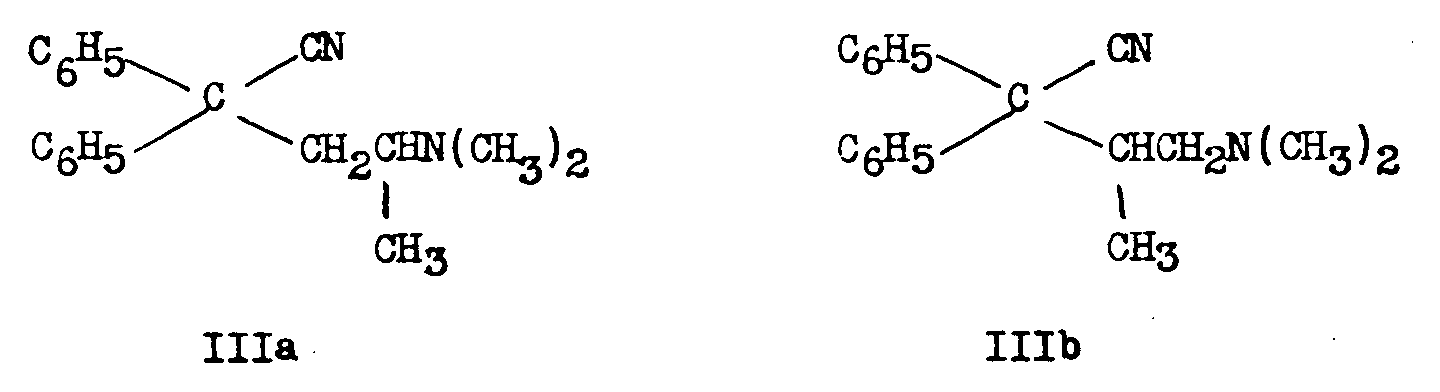 The condensation between diphenylacetonitrile and 1-dimethylamino-2-chloropropane according to the German process gives rise to two isomeric nitriles IIIa and IIIb in approximately equal amounts.