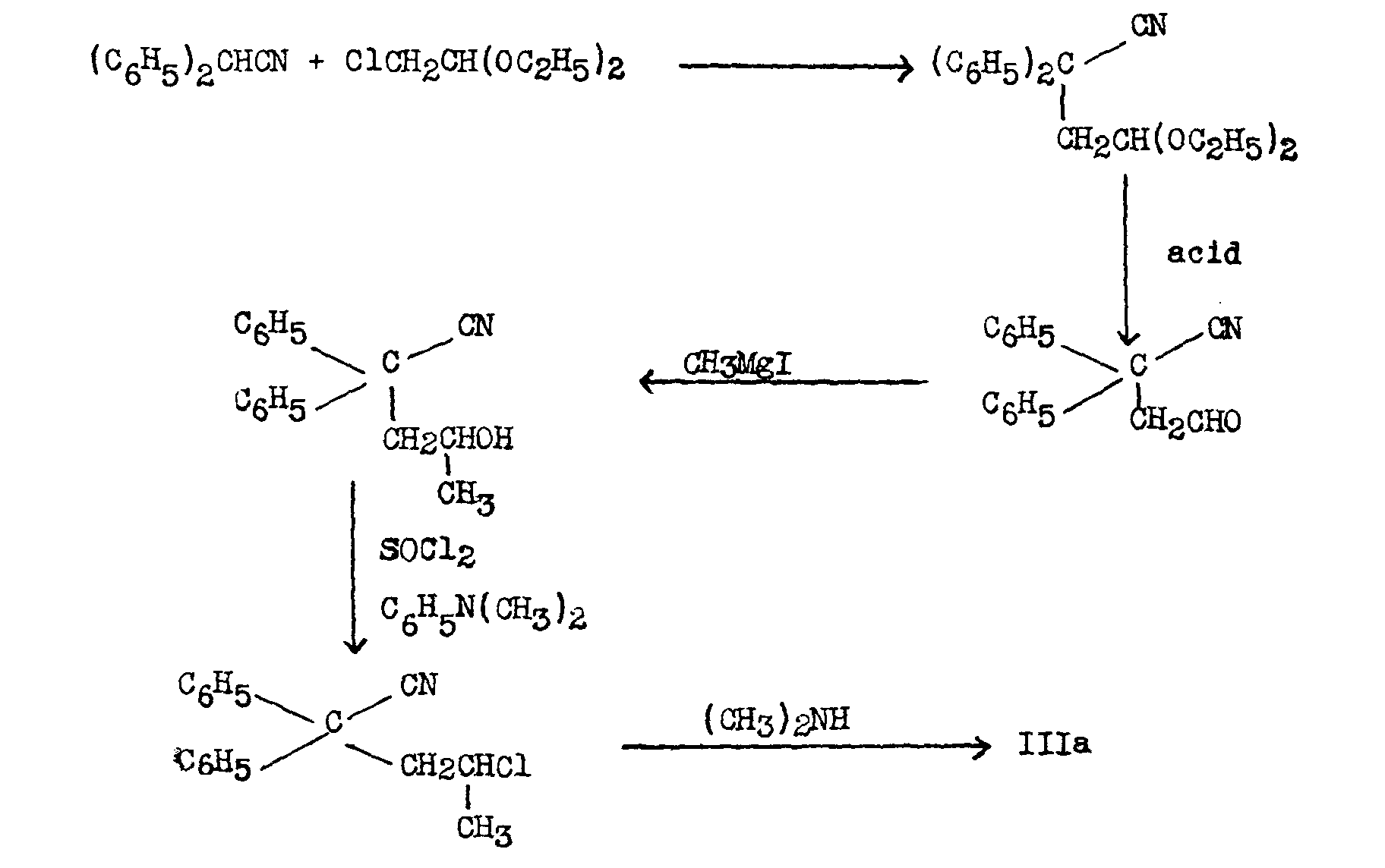 Easton, et al. ([22] ), devised the following sequence leading to IIIa, the nitrile precursor of Methadone. Yields in the last step were poor, an important side reaction being the dehydrohalogenation produced by dimethylamine.