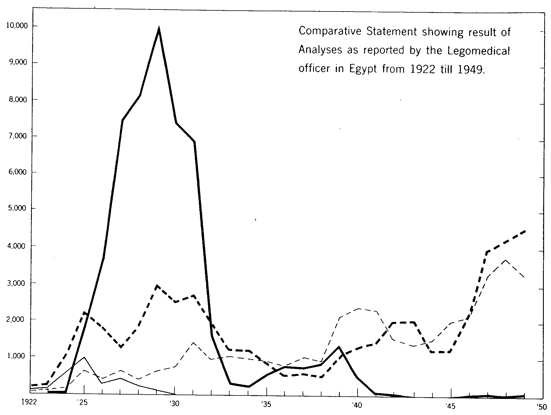 Before the first World War, there had been no drastic narcotic regulations in Egypt. The maximum penalty was 7 days' imprisonment or a fine of LE 1.[39] There had been no need for stronger measures. When it became evident that the heroin habit had become a serious problem, a new law was enacted which became effective in 1925. This new law made the trafficking in and the possession of narcotics illegal, classifying the offence as a "délit"with a maximum penalty of 1 year's imprisonment and LE 100 fine. During the first twelve months after the enactment of the new law, 5,600 prosecutions were made under it in Cairo alone. Within the year the maximum penalties were increased to 5 years' imprisonment and LE 1,000 fine. The new law made the drug traffic much more difficult in Egypt, but wholesale smuggling of the heroin began and increased in intensity until 1929. It is interesting to compare the number of seized heroin samples with the other narcotics in Egypt after the narcotic law in 1925. The number of seizures is a good indication of the traffic in narcotics. It seems from the table that the addiction to heroin in Egypt reached its peak in 1929 and from then on it dropped rapidly.