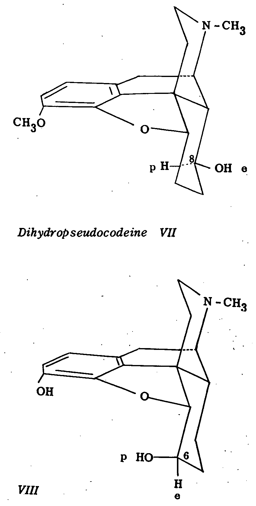 Similarly, dihydro allopseudocodeine (VI) (polar hydroxyl at C 8) is oxidized to dihydro pseudocodeinone in 40 per cent yield but dihydro pseudocodeine (VII) (equatorial hydroxyl at C 8) is recovered unchanged under the conditions of the oxidation. Dihydromorphine (VIII) with a polar hydroxyl group at C 6, is oxidized analogously to dihydromorphinone in 71 per cent yield. These experimental results are in accord with the general experience in the preferential oxidation of polar alicyclic alcohols (cf. 3).