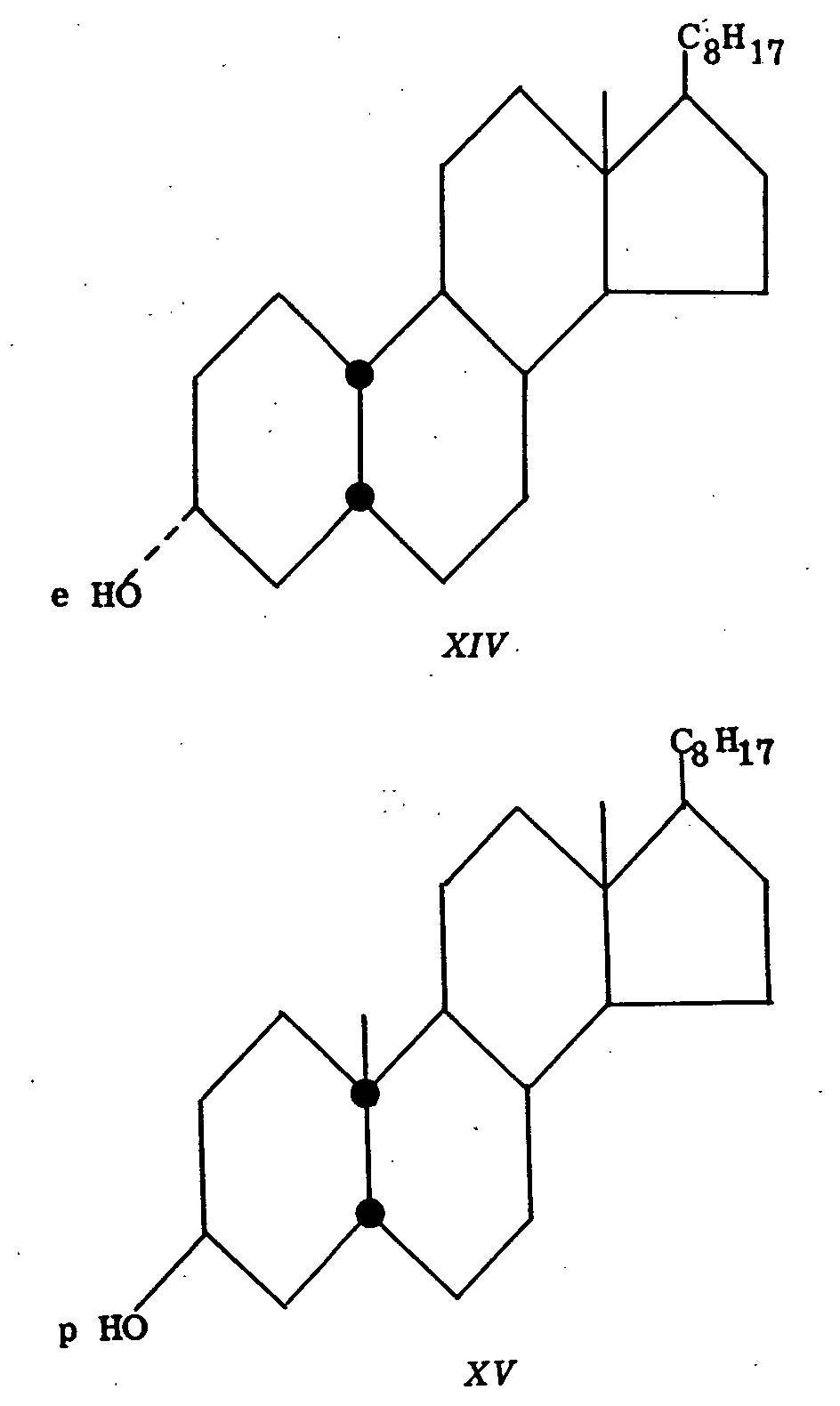 Coprostanone (XIII) (rings A and B cis-fused) on reduction with platinum in neutral solution gives epi-coprostanol (XIV) (equatorial hydroxyl) while reduction in acid solution gives coprostanol (XV) (polar hydroxyl). Coprostanol upon treatment with sodium alkoxide at 180° is converted to epicoprostanol, indicating that in the presence of alkali the stable isomer is the one bearing the equatorial alcoholic function.
