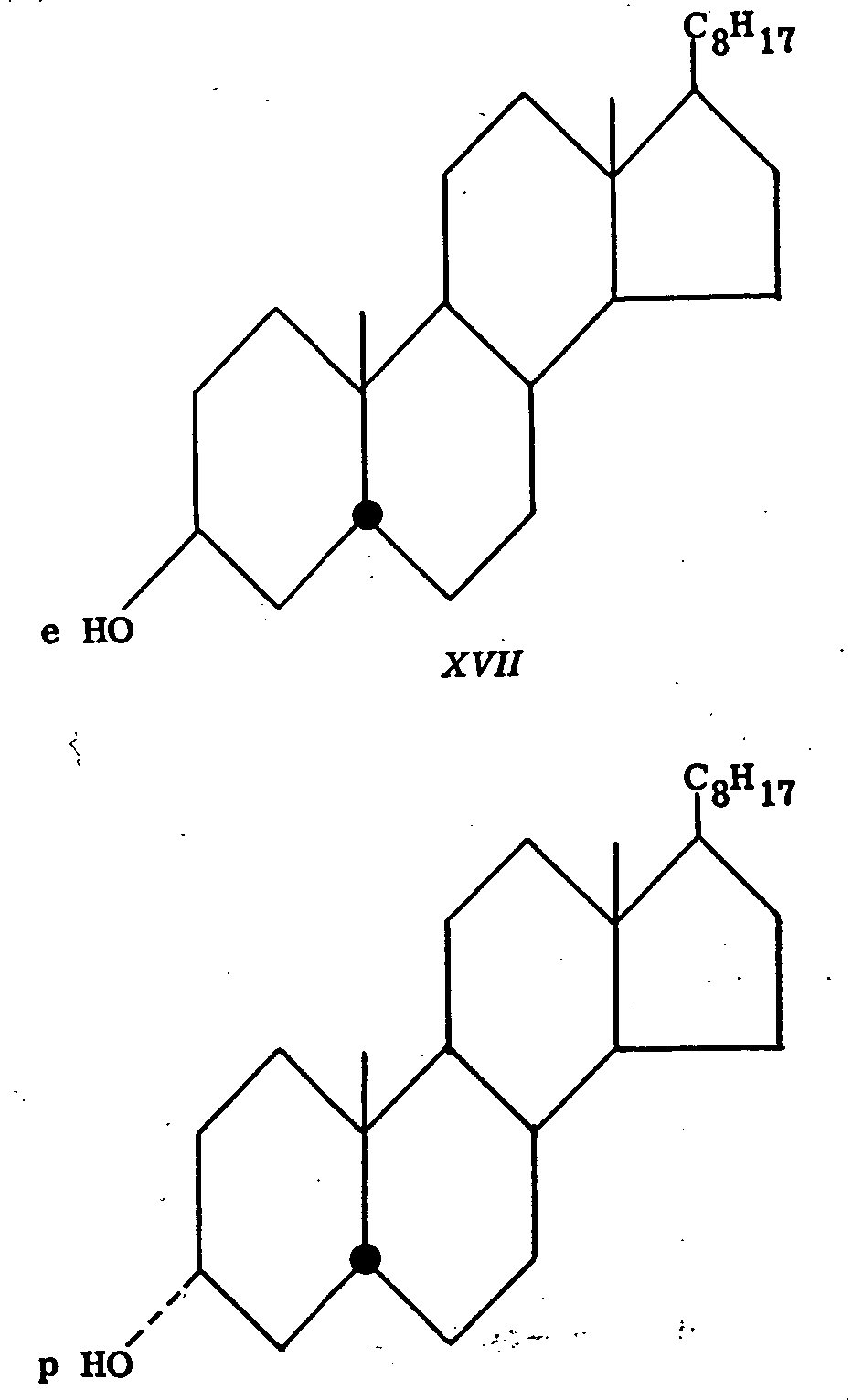 Coprostanone upon reduction with lithium aluminium hydride affords the 3α-alcohol (XIV) (equatorial hydroxyl) in 94 per cent yield and the 3 β-epimer (XV) (polar hydroxyl) in only 4 per cent yield. Similarly, cholestanone (XVI) gives 91 per cent of the 3 β-alcohol (XVII) (equatorial hydroxyl) and 4 per cent of the 3α-isomer (XVIII) (polar hydroxyl) (19).