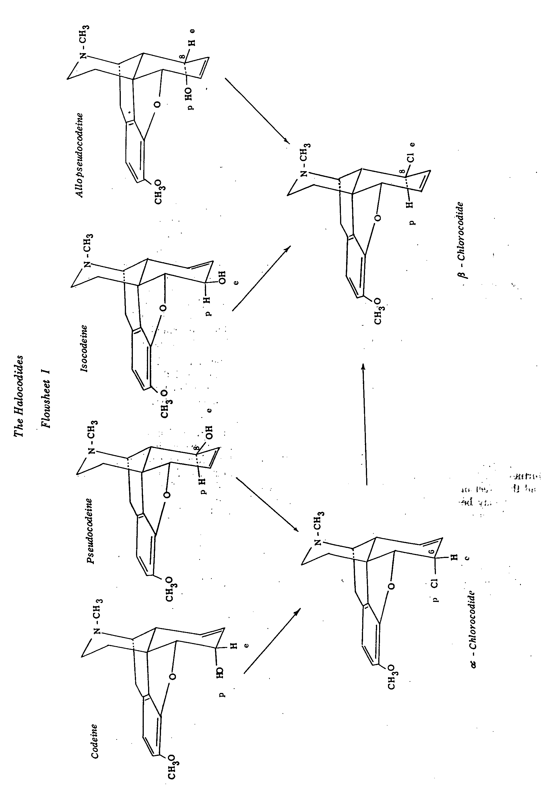 Flowsheet I summarizes the relationships between codeine and its isomers and the chlorocodides. Stork ([23] ) has brilliantly interpreted the above interconversions on the basis of present knowledge of the mechanisms involved. It is therefore unnecessary to repeat the arguments here.
