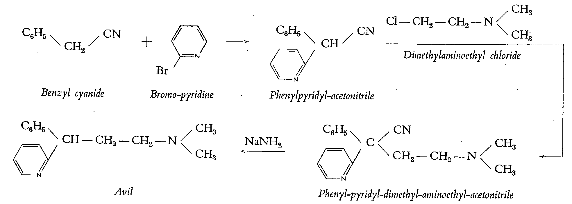 The introduction of heterocyclic ring systems instead of the phenyl radical constituted an important advance. In this way the antihistamine Avil ® (known in the U.S.A. as Trimeton ®) was produced.