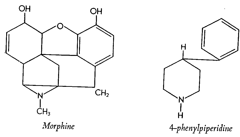 This formula emphasizes and justifies the conception of morphine as a 4-phenylpiperidine derivative, and, furthermore, we recognize the central quaternary carbon atom mentioned before as common to all the compounds described. We have thus found a parallel between Dolantin (or Cliradon) and diphenylmethane on the one side and morphine on the other.