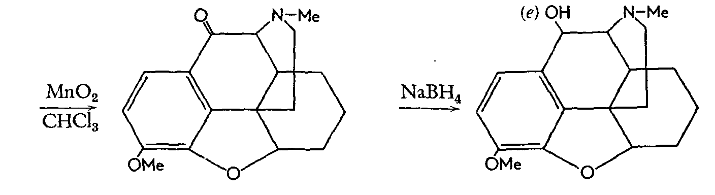 By oxidation of dihydrodesoxycodeine with cold chromic acid in dilute sulfuric acid, the 10-hydroxy-derivative(XX) was obtained. This being an allylic alcohol, it was successfully oxidized by manganese dioxide to yield the 10-ketone(XXI) . Sodium borohydride reduction of the latter gave in quantitative yield an alcohol epimeric with XX. It should be noted in passing that chromic acid oxidation in this case afforded very little of the 10-ketone, whilst Jeger and collaborators ([9] ; see above) obtained a good yield of 10-oxoderivative in their chromic acid in acetic acid oxidation.