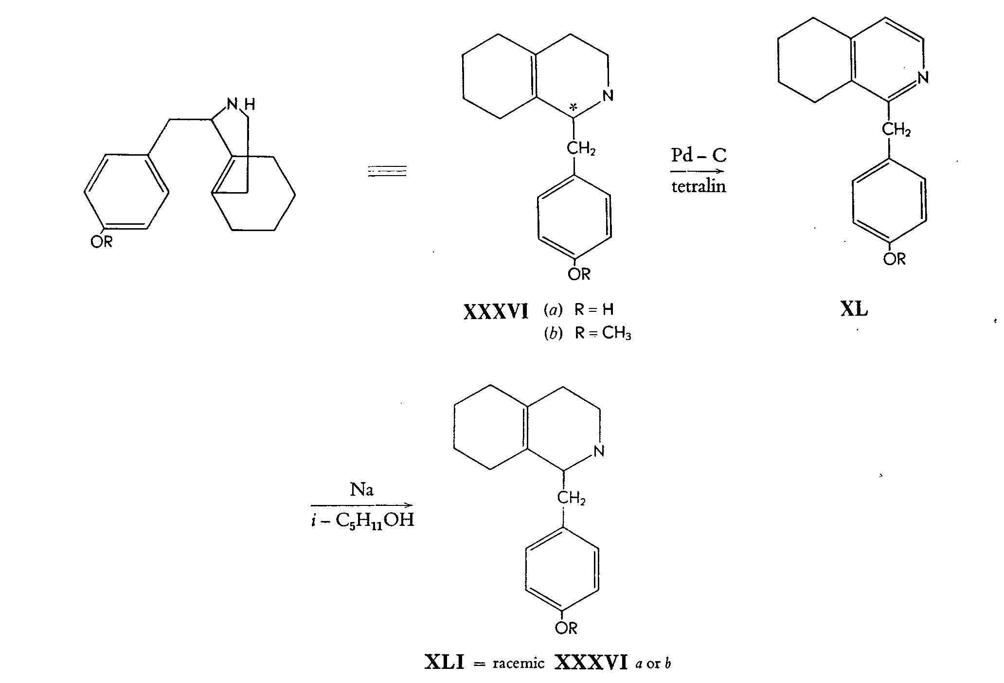 The undesired active form of XXXVI a or of its methyl ether (XXXVI b) is dehydrogenated with palladium-charcoal in boiling tetralin. Reduction of the resulting Bz-tetrahy droisoquinoline(XL) with sodium in isoamyl alcohol affords the racemic form of XXXVI a or b, respectively, and this can be resolved optically by recycling of the racemate with additional batches of synthetic racemic material. The dehydrogenation, of course, destroys the asymmetric carbon atom marked with an asterisk in structure XXXVI a or b. Conversion of XL to XLI can also be achieved by catalytic reduc- tion of the quaternary bromobenzylates formed from XL by way of the tertiary N-benzyl- 1,2,3,4,5,6,7,8-octahydro isoquinoline s(racemic XXXVIII).