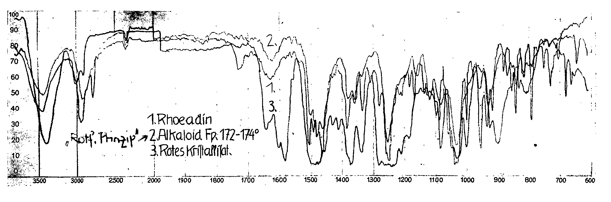 We had only a very limited supply of red-coloured crystalline substance deriving from a Papaver Rhoeas alkaloid, the I-R absorption of which as compared with rhoeadine and the "red-colouring principle" is shown in diagram 1. Paper chromatography was used almost exclusively for its investigation. Paper chromatographically speaking, the red crystalline substance and the also dark red-brown pentahy-droxy-flavylium chloride (Cyanidin), which also melts at over 350°, are not in any way identical.