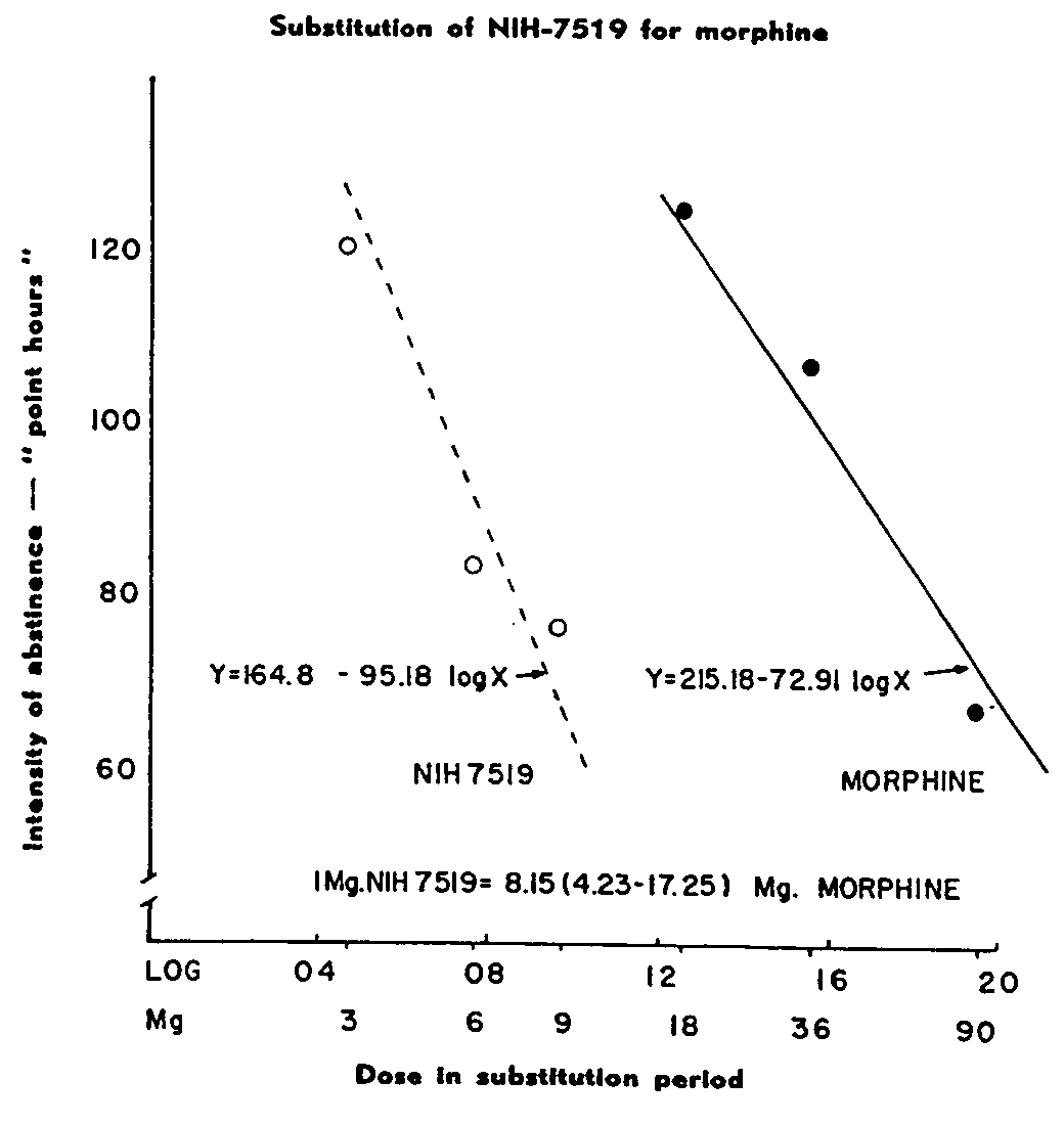 One difference from morphine shared by both of these compounds is that the dosage of both, particularly NIH-7519, could not be increased proportionately as rapidly as that of morphine. When morphine was used in parallel addictive studies, it was always possible to increase the dosage from 40 mg daily to 180 to 345 mg daily (depending upon body weight) within the first 18 days of administration. In fact, it was possible to increase the dosage of morphine sulfate in non-tolerant former opiate addicts to 500 mg daily within ten days without the development of dangerous toxicity [ 6] .