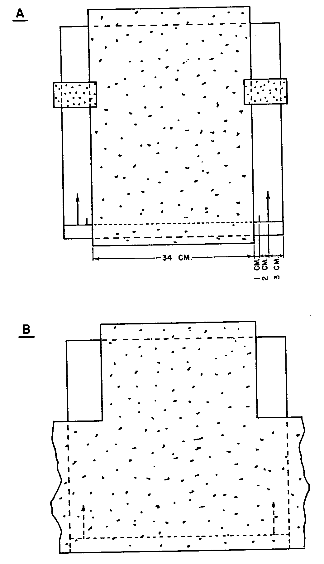 Chromatograms were prepared for spraying according to the procedure illustrated in figure 2. The exposed areas in figure 2 A were then sprayed with the potassium iodoplatinate, except for the caffeine spot, which had been covered. The caffeine areas were then uncovered (see figure 2 B). The chromatogram was sprayed. This time the modified Dragen-dorff reagent was used (12). The caffeine spots produced a bright orange colour. The chromatogram was then examined carefully, and the boundaries of the stained areas of the three components were marked. Straight lines were then drawn horizontally across the chromatogram. There were three areas of paper which were then cut out and sliced into fine shreds, transferred to separate Erlenmeyer flasks and eluted.