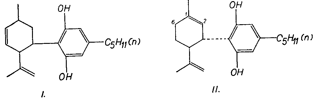 Korte & Sieper [27] have described in detail a technique of column chromatography followed by countercurrent separation by which crystalline cannabidiol (and possibly also THC) has been isolated from cannabis grown in Germany. By applying countercurrent distribution and using the system n-hexane-methanol- water (10:9:1) they have also isolated two isomers from THC-resin, prepared synthetically according to Adams et al. [1] . The first was in the form of long colourless needles, melting at 128?C, and the second in colourless prisms melting at 62-63?C. In another publication (28), the same authors reported on a third isomer, isolated in small quantities as colourless needles melting at 86-87?C. The three isomers may be distinguished one from another by ultraviolet absorption. The first exhibits a maximum at 266 m? (log ? 4.29), the second at 273 m? (log ? 4.12) and the third at 258 m? (log ? 4.25).