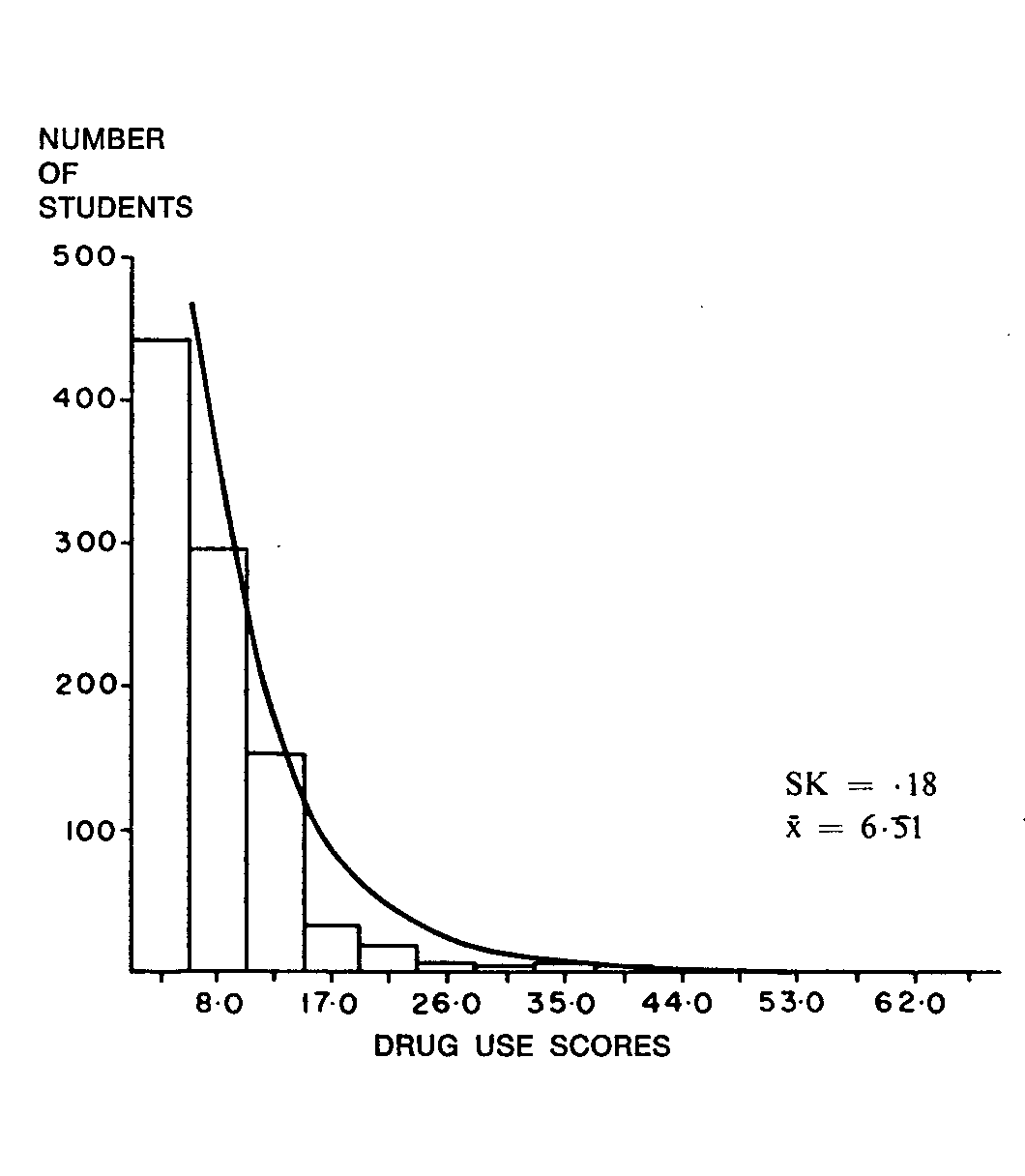Data from five high school drug use studies were employed in determining the fit of the log normal curve to the drug scores of users. The drugs involved were alcohol, tobacco, glue, marihuana, LSD, other hallucinogens, opiates, tranquillizers, stimulants and barbiturates. All five studies enquired about the use of 10 drugs and for each drug these were four categories related to frequency of usage. These were 1-2 times, 3-4 times, 5-6 times, and 7 plus times in the past months. Responses in each category were assigned to the mid-point so that the drug use frequencies were 1.5, 3.5, 5.5 and 7.5 respectively. Each drug user then had a score for each of the drugs used (1.5 to 7.5) and a total score varying from 1.5 to 75.0 comprising the sum of the scores for the 10 individual drugs. Only the total scores were used here. Persons who were not users of any drugs obtained scores of zero and were not included.