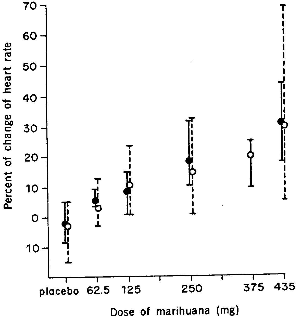 The first laboratory study made by Well and associates on smokers using marihuana cigarettes containing putative dosage of 4.5 to 18 mg. Δ-9-THC, does illustrate the uncertainties inherent in clinical investigations performed with cannabis of uncertain potency. In this study non-users experienced few subjective effects, demonstrated impaired performance on simple intellectual and psychomotor tests, moderate acceleration of heart rate (not dose related) and injection of the conjunctivae. "Experienced users" presented increases in heart rate higher than those observed in non-users and not dose related, reported a subjective" high" and a" slight improvement of their performance" (pursuit rotor test and digit-symbol substitution test). On the basis of these observations Well et al. concluded that "marihuana is a relatively mild intoxicant ", a view which can only be shared by all those who read their report. And readers were many since Well's paper was published in Science (1968), extensively quoted in Grinspoon's article on Marihuana published in Scientific American (1969) and the subject of a feature article on the front page of the New York Times. This paper certainly did contribute to the widely held belief in the United States that marihuana is a mild intoxicant with little untoward effects.