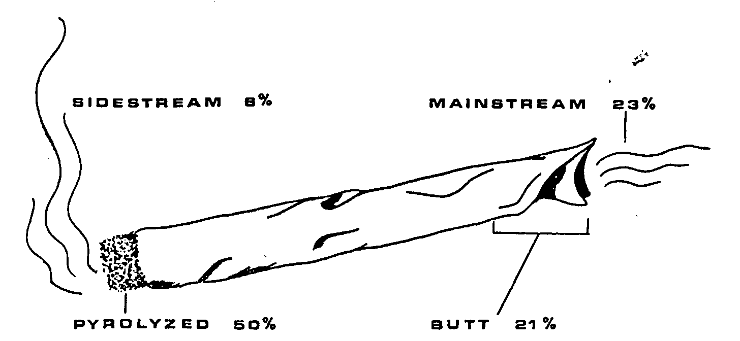 The relationship between the active constituents of the cannabis cigarette and the chemical by-products which may be produced in the burning process of smoking (pyrolysis) is not elucidated. The experiments performed by Manno et al. (1970) and by Truitt (1971), indicate that after insuring complete smoking of the cigarette end approximately 50% of the Δ-9-THC originally present in the cigarette is delivered unchanged in the smoke (fig. 5). Assuming that mainstream smoke (which is inhaled) accounts for 90 % of the smoke produced by the burning cigarette, the maximum efficiency of delivery of Δ-9-THC by an experienced smoker would be 45%, providing the entire cigarette is burned.
