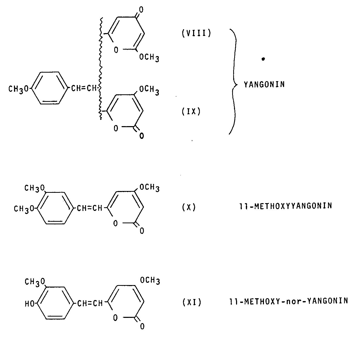 Yangonin serves as the basis for two additional substances isolated from Kava-kava, both of which have been established synthetically as possessing the α-pyrone ring. These are the meta-methoxy analogue 11-methoxyyangonin (X) [ 19] and the phenolic counterpart 11-methoxy-nor-yangonin (XI) [ 15] . These substances show a structural resemblance to the parent methylenedioxy compound methysticin in a manner completely analogous to examples within the essential oil family. Anethole (XII, 4-OCH 3), methyl-isoeugenol (XII, 3,4-(OCH 3) 2), isoeugenol (XII, 3-OCH 3-4-OH), and isosafrole (XII, 3,4-OCH 2O) are exact analogues of yangonin, 11-methoxyyangonin, 11-methoxynoryangonin, and methysticin, resp. It is certainly possible that their origins employ common biosynthetic pathways.