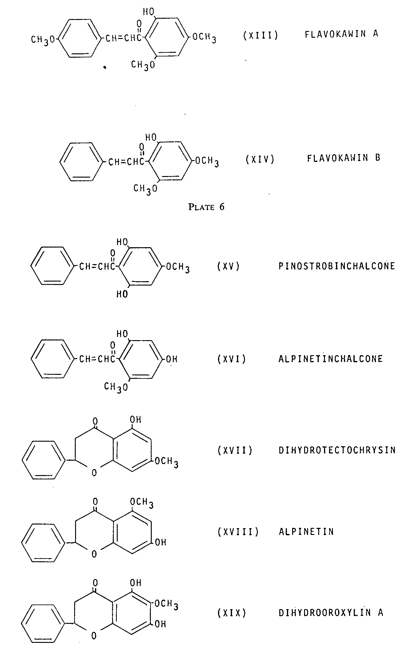 A number of other related flavanones have also been observed in this same New Guinea species, and it is entirely possible that at least two of them might have arisen through a chemical modification of these above-mentioned chalcones as a consequence of isolation. Dihydrotectochrysin (XVII) is the cyclization product of pinostrobinchalcone (XV), and alpinetin (XVIII) is related similarly to alpinetinchalcone (XVI). Both of these compounds, regardless of their origins within the isolation procedures employed, represent several tenths of a per cent of the total plant extract.