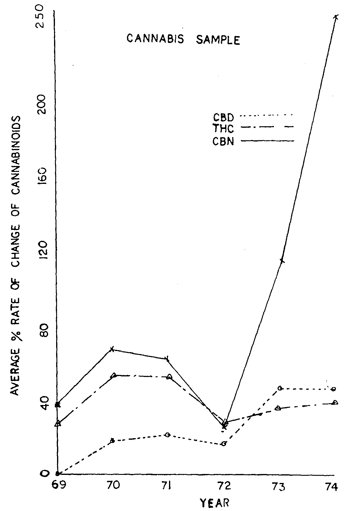 CBN increase in the 1974 sample extracts, retested in 1976, was not significant wherever the THC content was low (table 1). However, there was marked increase in CBN content in samples of 1973 and 1974. The average annual percentage rate of change of CBN in cannabis samples of 1973 and 1974 was considerably higher than that of sample extracts for the same years (table 3).
