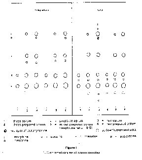 The second plate was sprayed with reagent (c), and after 10 min the red spot characteristic of raw opium appeared. The plate was then heated at 105°C for 15 min. Reddish spots were seen, including morphine and codeine which appeared as red-brown and bright-pink spots respectively. The plate was also observed under long-wavelength uv light for the presence of the yellow fluorescent spot of prepared opium. Further heating at the same temperature for another hour or so revealed thebaine and narcotine as brown-purple and yellow-orange spots respectively. Raw opium also showed minor dark spots below the morphine and above the narcotine spots which fluoresced in long uv light when viewed immediately after heating. (if the plate was allowed to stand overnight and again heated for 15 min, the thebaine spot was found to acquire a strong permanent purple-brown colour.) These coloured spots were observed to fade on cooling to room temperature but reappeared when reheated. The plate could further be oversprayed with reagent (b) and, after 20 min, dark purple spots on a greyish background were seen. Figure 1 and table 2 show the results of the TLC analysis.