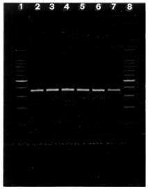a Lanes 2-6, Cannabis; lane 7, Humulus; and lanes 1 and 8, 100-bp DNA ladder (the bright fragment is 500 bp long).