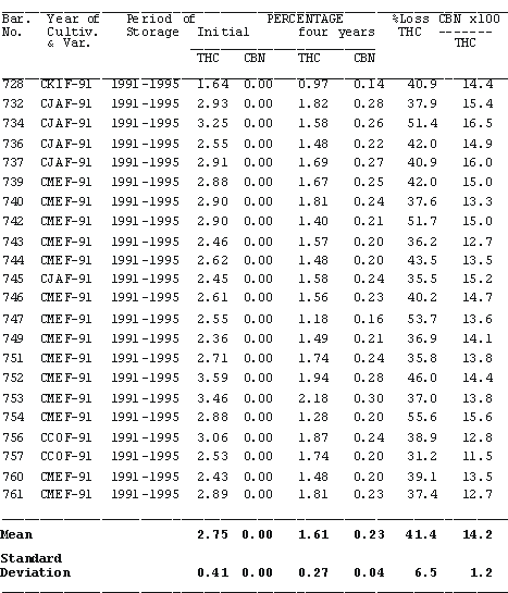 The dried plant material was stored in closed barrels in the dark in a secured air-conditioned vault. Room temperature fluctuated slightly over time but generally remained between 20o and 22o C. Samples were obtained annually from stored material for cannabinoid analysis.