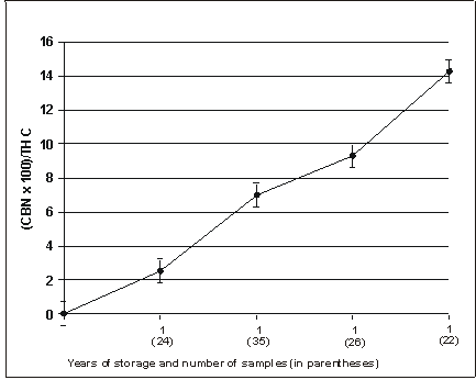 Several attempts were made to develop a relationship between the time of storage and the concentration of THC and CBN. It was found that the percentage ratio of CBN to THC at the time of analysis was most predictive of the age of the plant material. Tables 1-4 show the values for all samples stored for one, two, three and four years, respectively. On average, the percentage ratio of CBN to THC was found to be 2.5 ±0.9, 6.7 ±1.4, 9.4 ±1.7 and 14.2 ±1.2 for samples stored for one, two, three and four years respectively, as reflected in figure II.